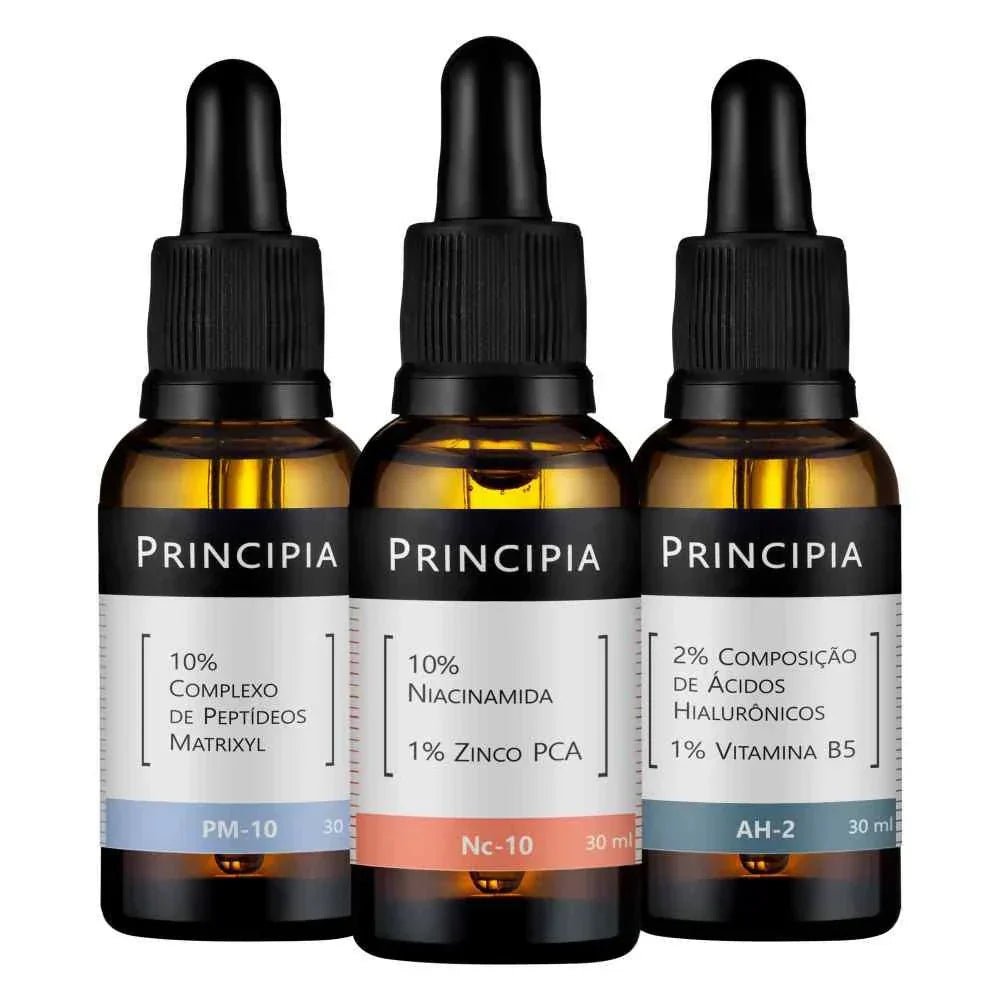 Kit com um sérum com 10% de Niacinamida + 1% de Zinco PCA, um sérum com 10% de Peptídeos Matrixyl e um sérum com 2% de Ácidos Hialurônicos + vitamina B5, em caixa de presente.