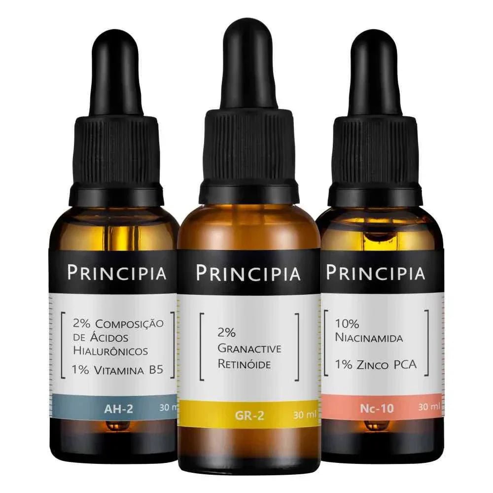 Kit com três fórmulas: um sérum com Niacinamida + Zinco PCA, um sérum com Ácidos Hialurônicos + Vitamina B5 e uma emulsão com Granactive Retinóide, em caixa de presente.