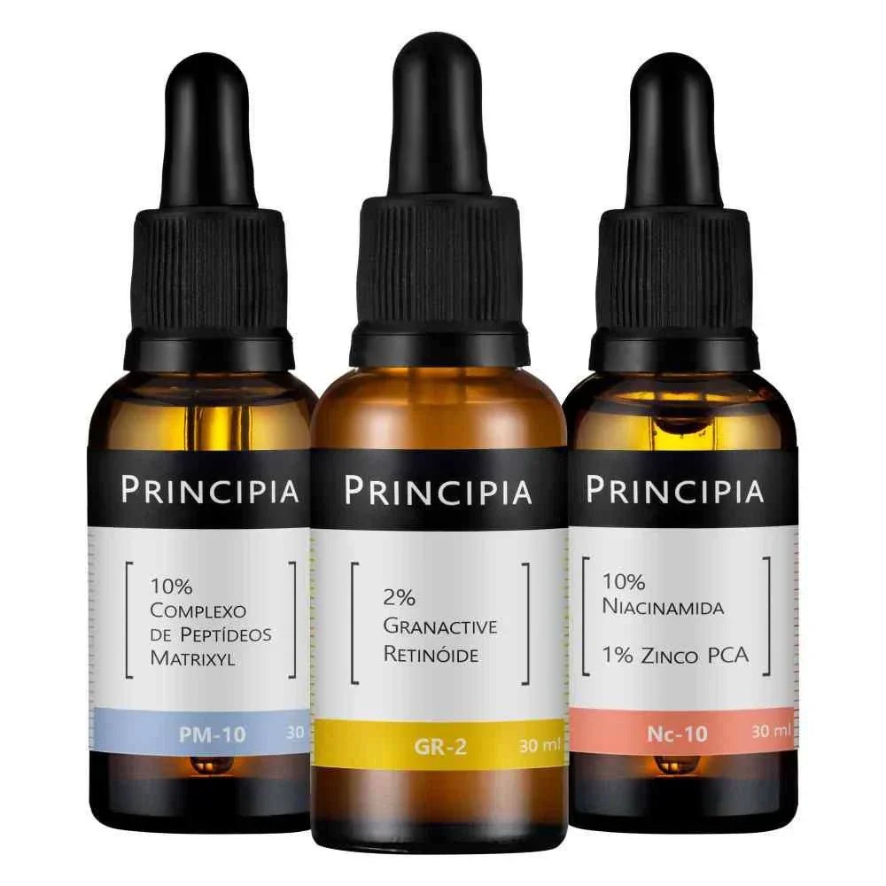 Kit com três fórmulas: uma emulsão com Granactive Retinóide, um sérum com Niacinamida + Zinco e um sérum com Peptídeos Matrixyl, em caixa de presente.