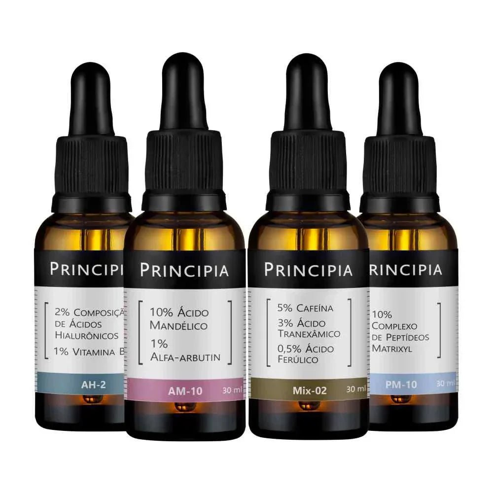 Kit com um sérum com 10% de Ácido Mandélico + 1% de Alfa-arbutin, um sérum com 10% de Peptídeos Matrixyl, um sérum com 2% de Ácidos Hialurônicos e um sérum Mix-02, em caixa de presente.