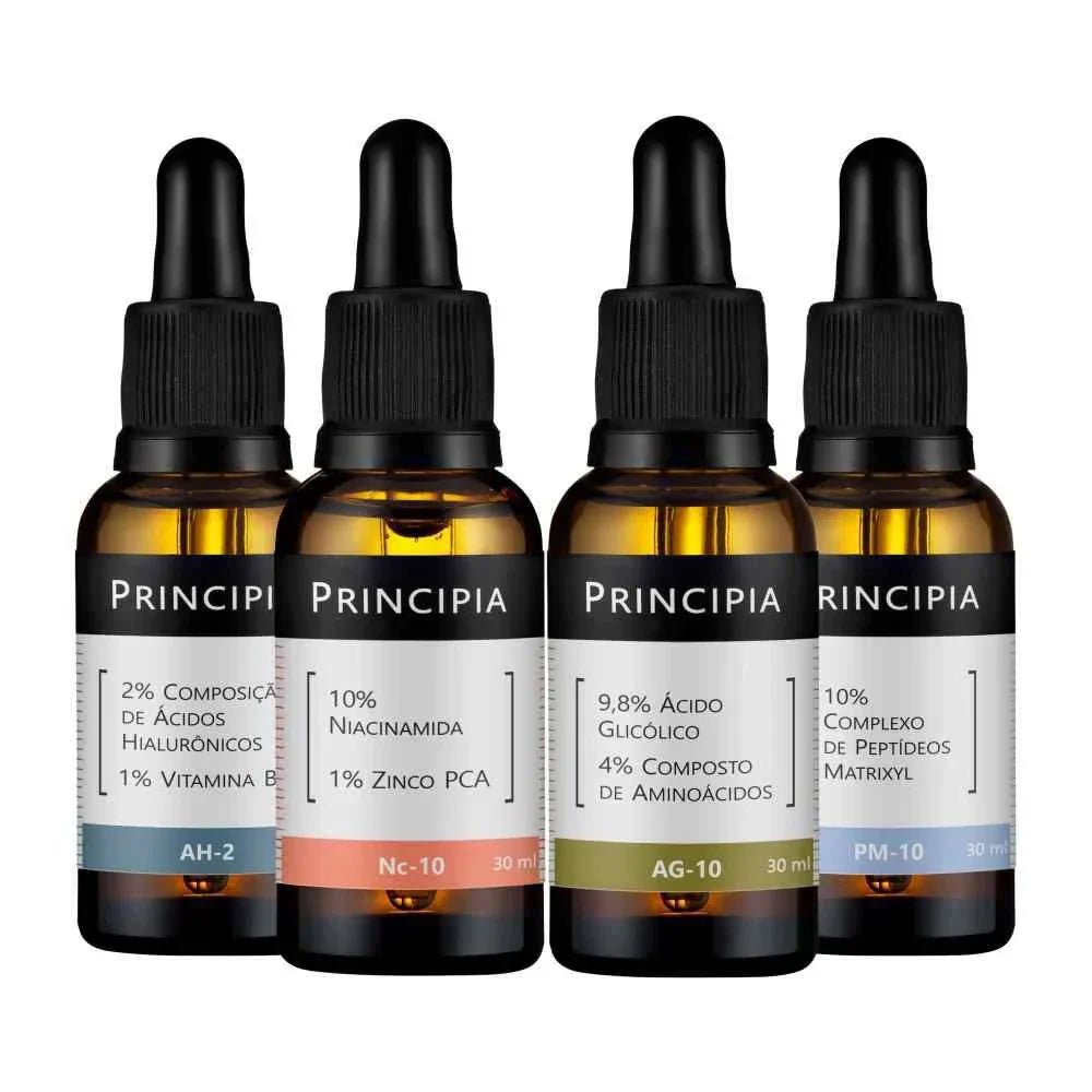 Kit com um sérum de Niacinamida + Zinco, um sérum com Ácido Glicólico + Aminoácidos, um sérum com Peptídeos Matrixyl e um sérum com Ácidos Hialurônicos, em caixa de presente.