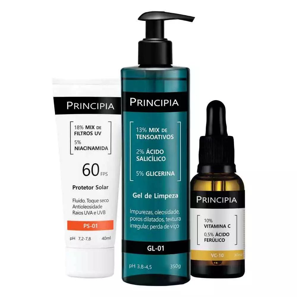 Kit com três fórmulas de skincare para uma rotina básica: um gel de limpeza com mix de tensoativos + salicílico + glicerina, um sérum de vitamina C + ferúlico e um protetor solar fluído FPS 60 + niacinamida, ação antioleosidade, toque seco e com eficácia contra raios UVA e UVB, luz visível e azul.